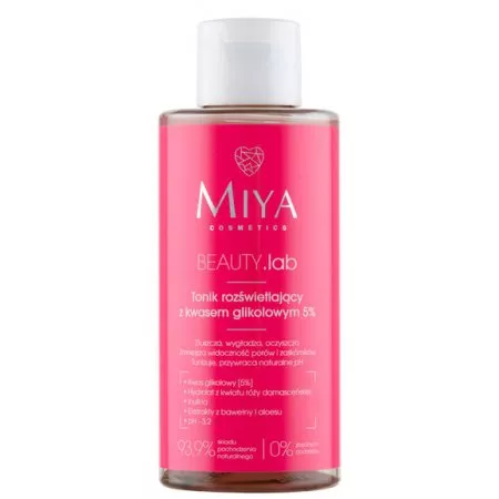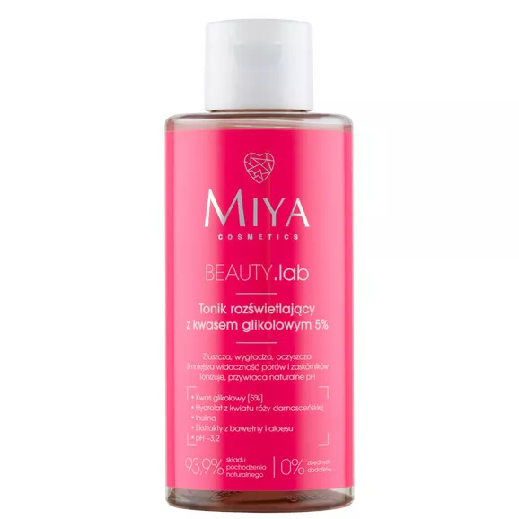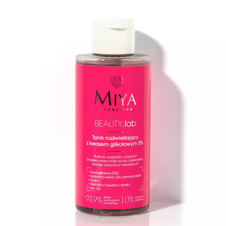 Tonik rozświetlający Miya Beauty Lab jest dedykowany każdemu typowi skóry, idealnie zadba też o cerę trądzikową i tłustą. Dzięki niemu zapomnisz o takich problemach, jak przebarwienia, nierównomierny koloryt skóry, małe blizny i zmarszczki. Kosmetyk rozprawi się też z zaskórnikami. Ten kosmetyk działa wielotorowo. Tonizuje, złuszcza i wygładza, działa oczyszczająco. Ponadto poprawia kondycję i wygląd skóry: nawilża, upiększa, rozświetla cerę, przywraca blask, wyrównuje koloryt, zmniejsza widoczność przebarwień i plam pigmentacyjnych, ujędrnia i zwiększa napięcie skóry. Ph 3,2.