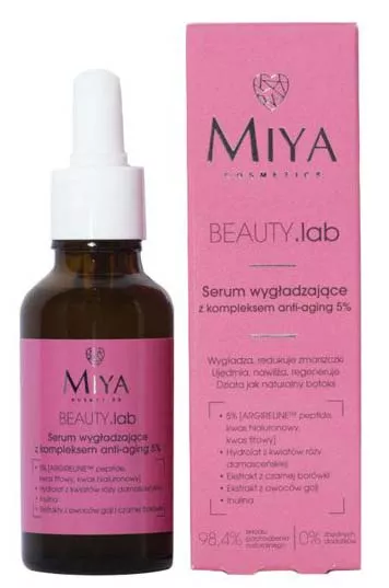 Nie potrzebujesz botoksu, jeśli masz pod ręką serum wygładzające z kompleksem Argireline Miya BEAUTY.lab. Kompleks ten zawiera peptydy, kwas fitowy i kwas hialuronowy. Serum intensywnie wygładza cerę i działa przeciwstarzeniowo, ujędrnia oraz redukuje zmarszczki. Ponadto działa nawilżająco. Stosowanie serum widocznie poprawia kondycję skóry. Kosmetyk rozjaśnia, redukuje oznaki zmęczenia i pozostawia cerę wypoczętą.