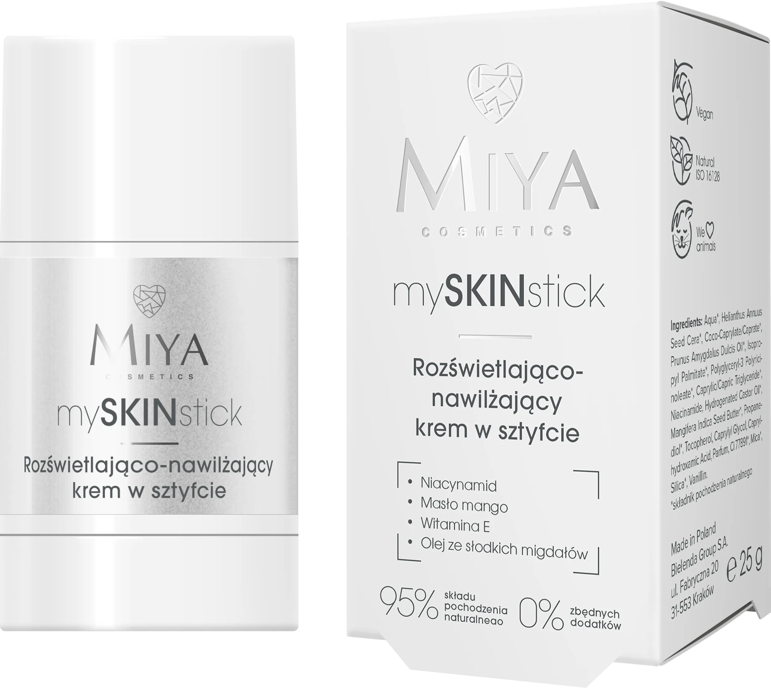 Odkryj błyskawiczny sposób na promienną i nawilżoną skórę! Miya Cosmetics mySKINstick to rozświetlająco-nawilżający krem w sztyfcie, który łączy pielęgnację z efektem naturalnego glow. Lekka, komfortowa formuła wtapia się w cerę, wygładza ją, nawilża i delikatnie rozświetla ? zawsze, kiedy tego potrzebujesz. Idealny do codziennej pielęgnacji oraz szybkiego odświeżenia w ciągu dnia, niezależnie od typu skóry.