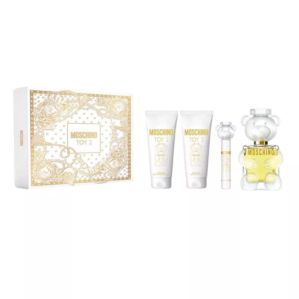 Zestaw Moschino Toy 2 to idealny wybór dla kobiet, które cenią sobie szalone, zmysłowe i pewne siebie podejście do życia. W skład zestawu wchodzi woda perfumowana 100ml, perfumowany balsam do ciała 100ml, mini woda perfumowana 10ml oraz perfumowany żel pod prysznic 100ml. Kompozycja zapachowa Toy 2 to kwiatowo-drzewno-piżmowa mieszanka, która zadebiutowała na rynku w 2018 roku.