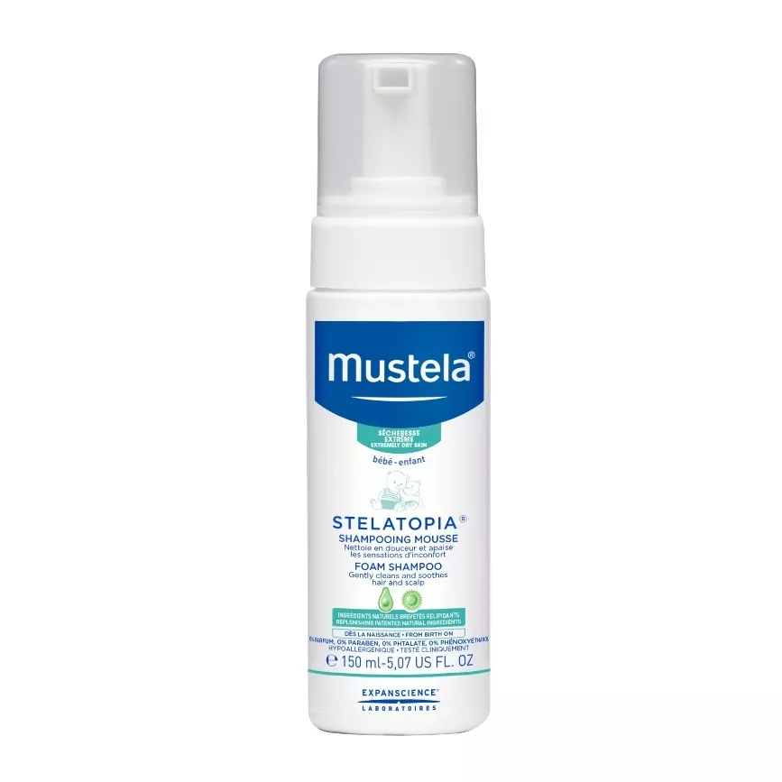 Mustela Stelatopia Foam Shampoo to wyjątkowy szampon w piance, stworzony specjalnie do pielęgnacji włosów i skóry głowy niemowląt ze skórą skłonną do egzemy. Ta delikatna, pozbawiona łez formuła o zrównoważonym pH, zawiera destylat oleju słonecznikowego, który koi i nawilża, oraz Avocado Perseose – opatentowany naturalny składnik, chroniący i wzmacniający delikatną skórę dziecka. Dla pełnej pielęgnacji skóry skłonnej do egzemy, stosuj w połączeniu z Stelatopia Emollient Cream lub Stelatopia Emollient Balm.