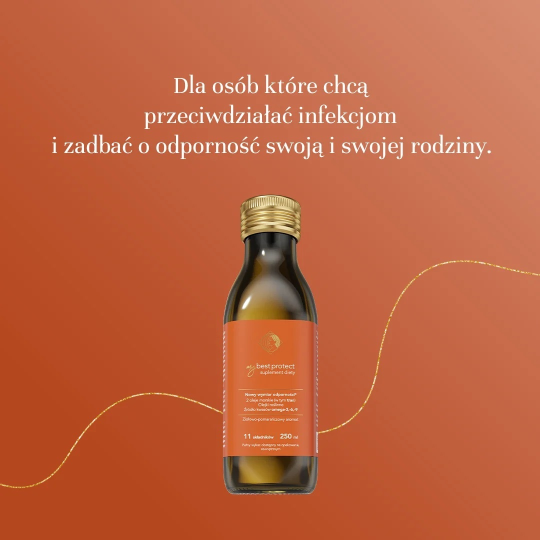 MyBestPharm MyBestProtect to suplement diety ziołowo-pomarańczowy w płynie o pojemności 250 ml, stworzony z myślą o kompleksowym wsparciu zdrowia i odporności całej rodziny. Produkt łączy w sobie wysoką zawartość kwasów omega-3, witaminę D3 oraz ekstrakty z roślin, co czyni go skutecznym wsparciem w codziennej profilaktyce zdrowotnej.