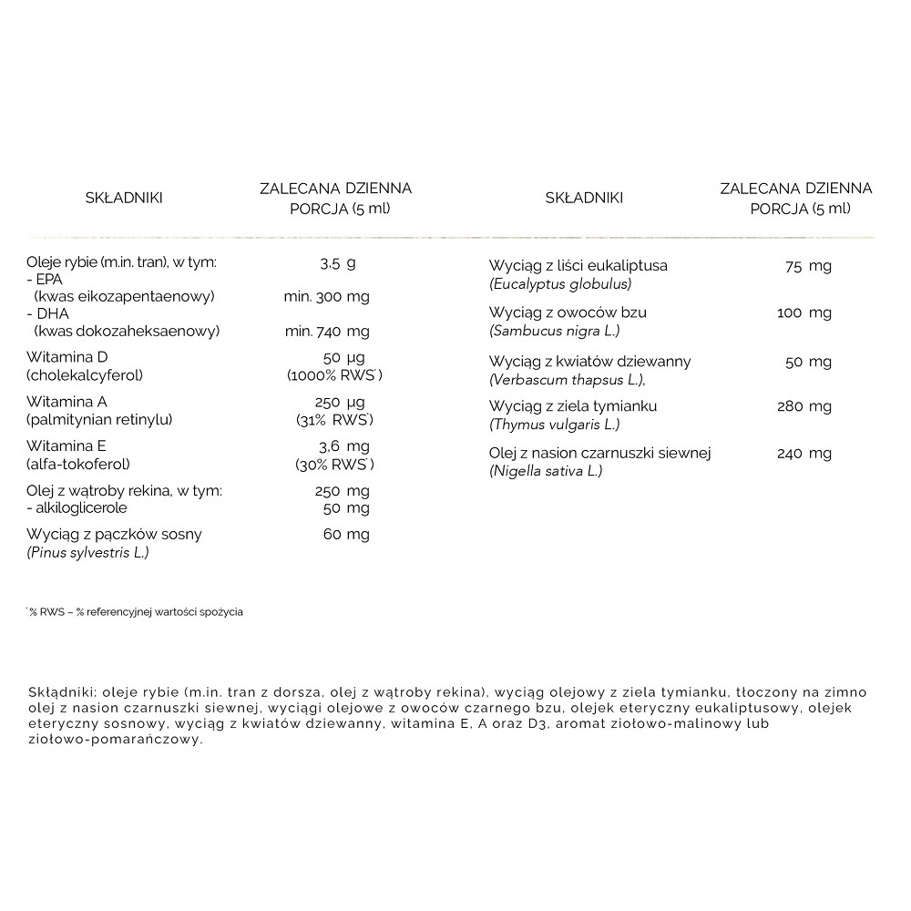 - Zawiera aż 3500 mg olejów rybich i 2000 IU witaminy D3 w jednej dawce.