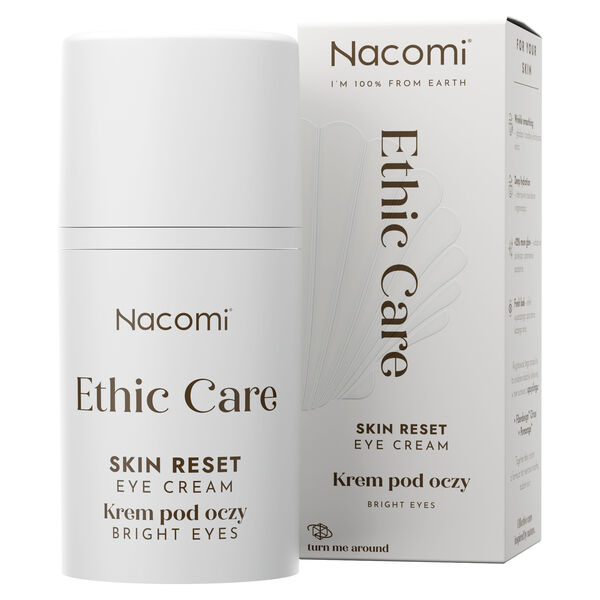 Nacomi Ethic Care Skin Reset Eye Cream to krem pod oczy, który dzięki połączeniu składników w 100% pochodzenia naturalnego skutecznie regeneruje delikatną skórę wokół oczu, zapewniając jej komfort i widocznie poprawiając wygląd. Formuła produktu została opracowana tak, aby przy regularnym stosowaniu zwiększyć blask skóry o 22% oraz zredukować zmarszczki o 7,3%*, co sprawia, że spojrzenie staje się wypoczęte i promienne.