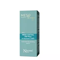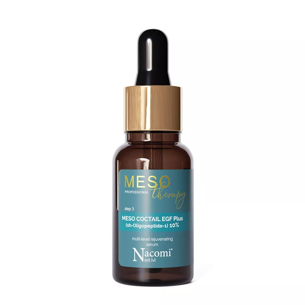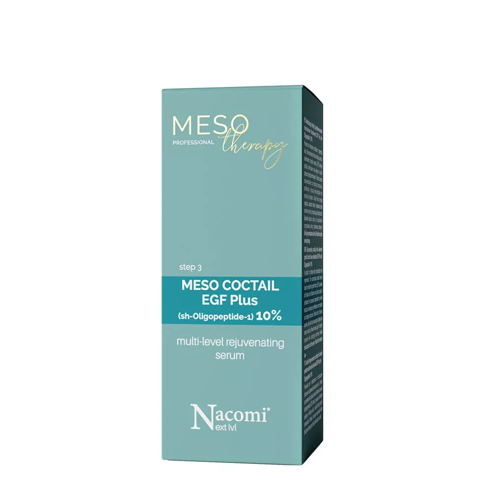Odmładzający koktajl Nacomi Meso Coctail EGF plus to intensywny preparat do odbudowy i regeneracji skóry, oparty na naskórkowym czynniku wzrostu EGF plus (sh-Oligopeptide-1). Skoncentrowana formuła aktywuje podziały komórkowe, poprawiając jakość połączeń międzykomórkowych. W efekcie produkt pomaga wygładzić skórę, ujednolicić jej koloryt i zredukować oznaki starzenia, przywracając skórze jędrność oraz elastyczność.