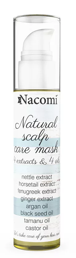 Zaufaj mocy czterem naturalnym olejom i czterem naturalnym ekstraktom i zyskaj pewność, że Twoje włosy będą mocne. Naturalna maska do pielęgnacji skóry głowy Nacomi dodatkowo zagęszcza włosy i redukuje problem ich wypadania, stymuluje wzrost włosów i wzmacnia je. W składzie znajdziemy aż cztery oleje: olej z czarnuszki, olej rycynowy, olej arganowy, olej tamanu. Ich moc jest spotęgowana czterema naturalnymi ekstraktami: z pokrzywy, skrzypu polnego, kozieradki, imbiru.