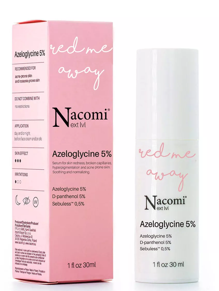 Kojące serum Nacomi Next Level to idealne rozwiązanie dla cery naczynkowej oraz skóry z trądzikiem różowatym. Zawiera olej z dzikiej róży, który wzmacnia naczynka, redukuje zaczerwienienia i zmniejsza stany zapalne. Dzięki połączeniu 5% stężenia azeloglicyny oraz SEBULESS™ serum doskonale sprawdza się również w przypadku cery trądzikowej i łojotokowej, normalizując wydzielanie sebum, rozjaśniając przebarwienia i wspomagając walkę z trądzikiem różowatym. Panthenol w składzie łagodzi podrażnienia oraz przyspiesza proces gojenia i regeneracji skóry.