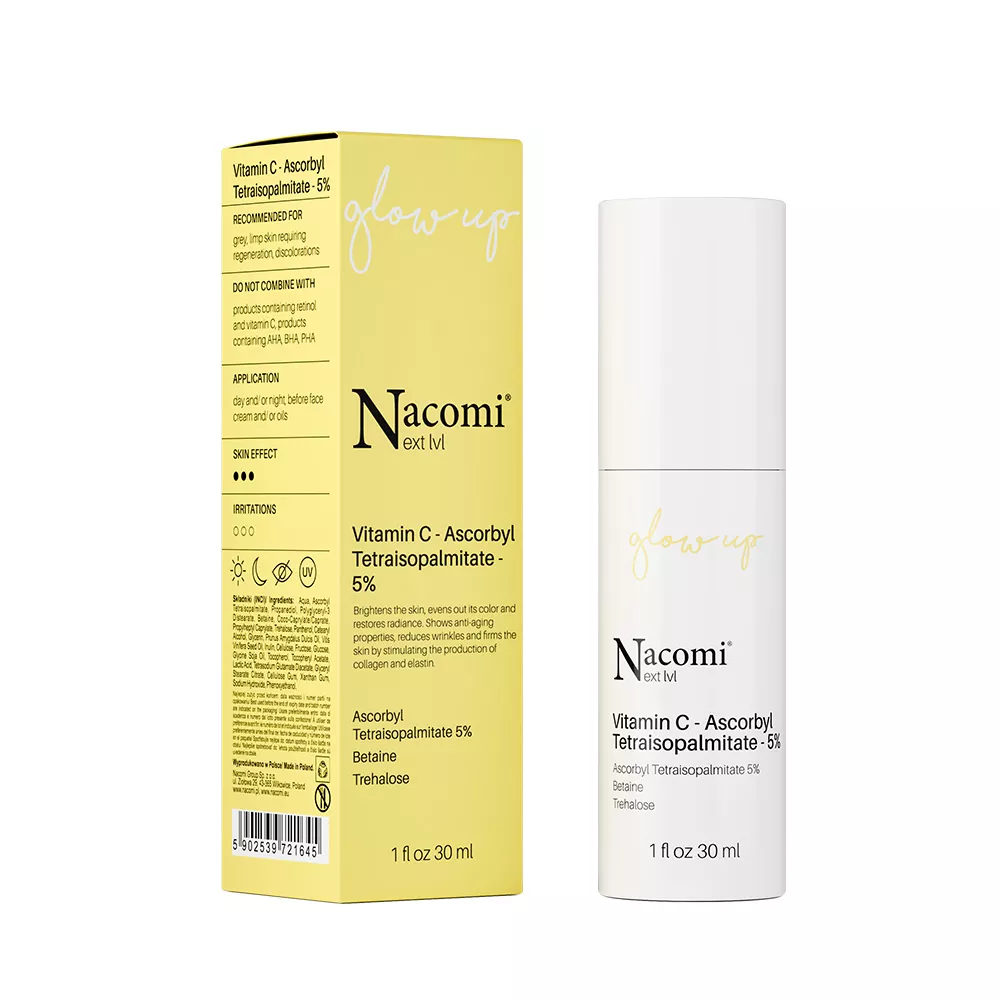 Serum Nacomi Next Level z witaminą C to doskonały wybór dla osób pragnących zachować młody i promienny wygląd skóry. Formuła oparta na 5% Ascorbyl Tetraisopalmitate, stabilnej formie witaminy C, skutecznie chroni skórę przed stresem oksydacyjnym. Regularne stosowanie produktu pomaga zredukować przebarwienia, wyrównuje koloryt skóry, a także zmniejsza widoczność zmarszczek, poprawiając jej jędrność. Dzięki temu serum, skóra odzyskuje swoją witalność, staje się jedwabiście gładka i rozświetlona. Starannie dobrane składniki aktywne wspierają walkę z oznakami starzenia, jednocześnie dbając o odpowiedni poziom nawilżenia.