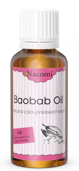 Olej z baobabu Nacomi to niezastąpiony kosmetyk w pielęgnacji skóry, paznokci i włosów. Bogaty w kwasy tłuszczowe omega 3, 6 i 9 oraz witaminy A, B, C i F, olej ten doskonale nawilża, regeneruje i chroni skórę, włosy oraz cerę, przyspieszając ich regenerację. Zawiera również fitosterole, fosfolipidy i minerały, które głęboko penetrują skórę, zapewniając jej intensywne nawilżenie i wygładzenie. Lekki i delikatny, nie zatyka porów, a jednocześnie intensywnie odżywia. Pomaga w redukcji zmarszczek, przebarwień i rozstępów, a także wzmacnia włosy, zapobiegając rozdwajaniu końcówek.