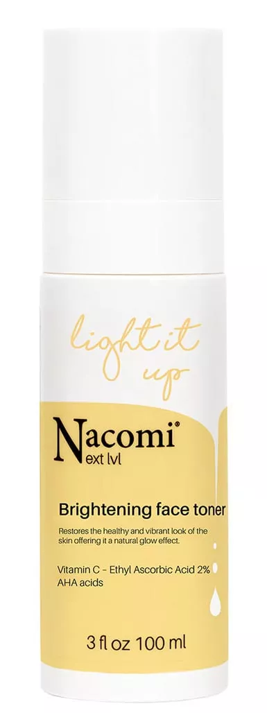 Tonik rozświetlający Nacomi Next Level to niezastąpiony kosmetyk, który przywraca skórze optymalne pH, jednocześnie rozjaśniając i dodając jej blasku. Dzięki niemu Twoja skóra zyska młodzieńczy wygląd i naturalny efekt glow. Formuła oparta na ultrastabilnej witaminie C oraz kwasach AHA delikatnie złuszcza, przyspiesza regenerację, wspomaga redukcję przebarwień i wyrównuje koloryt skóry. Ekstrakty z banana, liczi i malin zapewniają doskonałe nawilżenie, zmiękczenie i wygładzenie cery, podczas gdy ekstrakt z żeń-szenia dotlenia i odżywia komórki skóry.