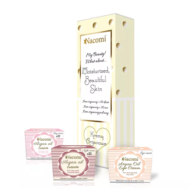 Podaruj bliskiej osobie złoto z Maroka i bogactwo piękna dzięki zestawowi Nacomi Kremy Arganowe. To trio kosmetyków zawierających drogocenny olej arganowy, które pomoże odkryć i podkreślić naturalne piękno. Zestaw zawiera krem pod oczy, krem na dzień 30+ oraz krem na noc 30+. Krem pod oczy dba o nawilżenie cienkiej skóry i zmniejsza pierwsze zmarszczki, nie zawierając parabenów ani sztucznych barwników. Krem na dzień z witaminą E wspomaga regenerację skóry i chroni ją przed czynnikami zewnętrznymi, a krem na noc z kwasem hialuronowym odżywia cerę i działa przeciwstarzeniowo.