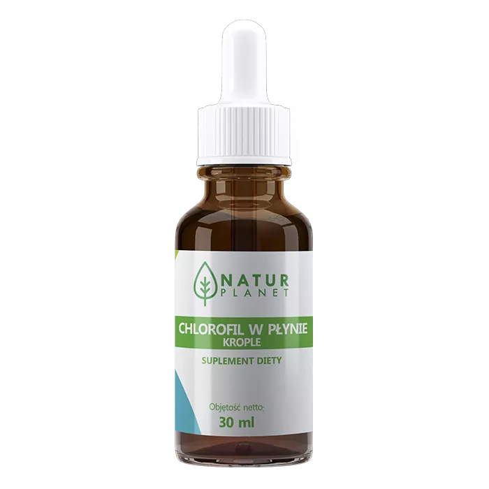 - Zawiera chlorofil – aż 45 mg w dziennej porcji (30 kropli).