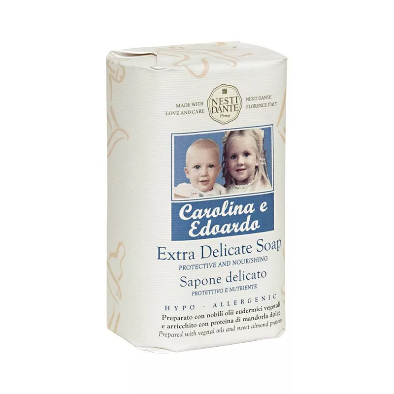 Naturalne, ultradelikatne i hipoalergiczne mydło toaletowe Nesti Dante Baby Carolina e Edoardo to idealny wybór do codziennej pielęgnacji wrażliwej skóry niemowląt i dzieci. Dzięki swojej unikalnej formule, wzbogaconej miodem, ekstraktem z nagietka oraz proteinami ze słodkich migdałów, mydło skutecznie chroni, odżywia i nawilża skórę, pozostawiając ją miękką i gładką w dotyku. Produkt jest wolny od siarczanów, parabenów i olejów mineralnych, co czyni go bezpiecznym i delikatnym dla delikatnej skóry najmłodszych.