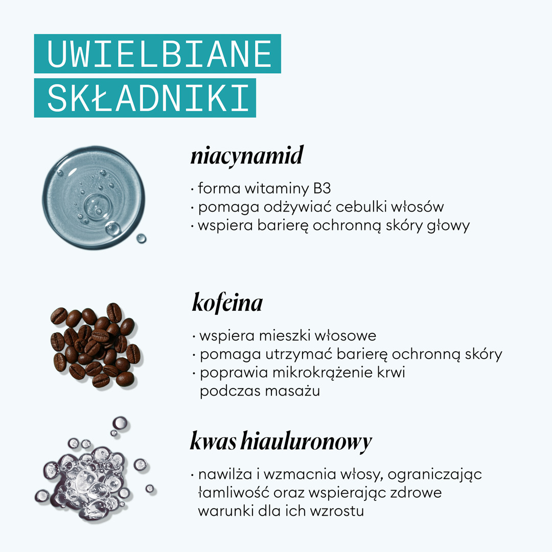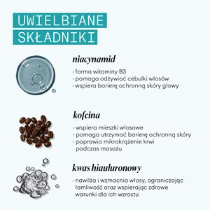 - Kofeina stymuluje mieszki włosowe, wspierając naturalną produkcję melaniny i chroniąc kolor przed blaknięciem.