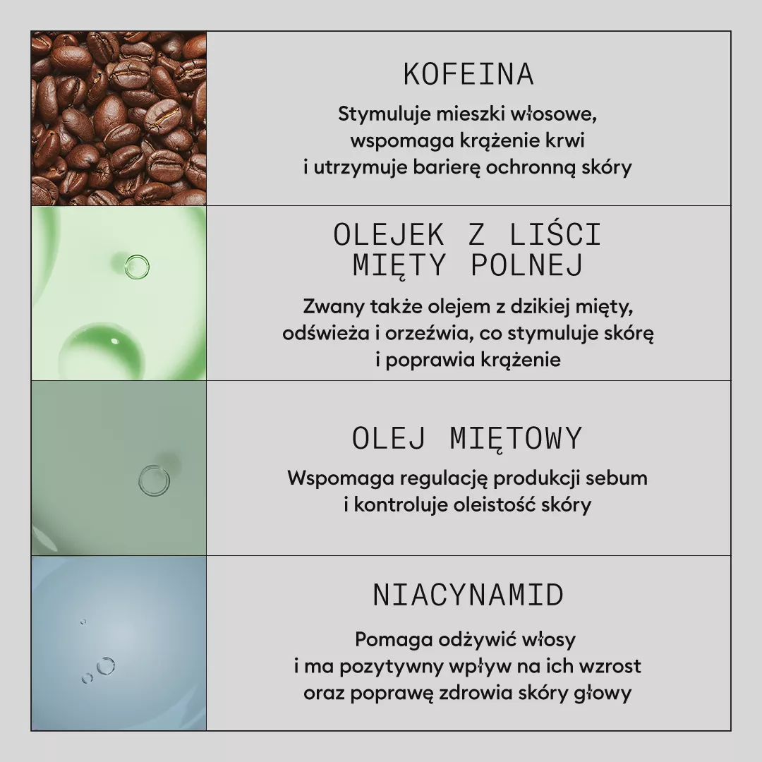 - Kofeina – pobudza cebulki włosów i wspomaga ich wzrost