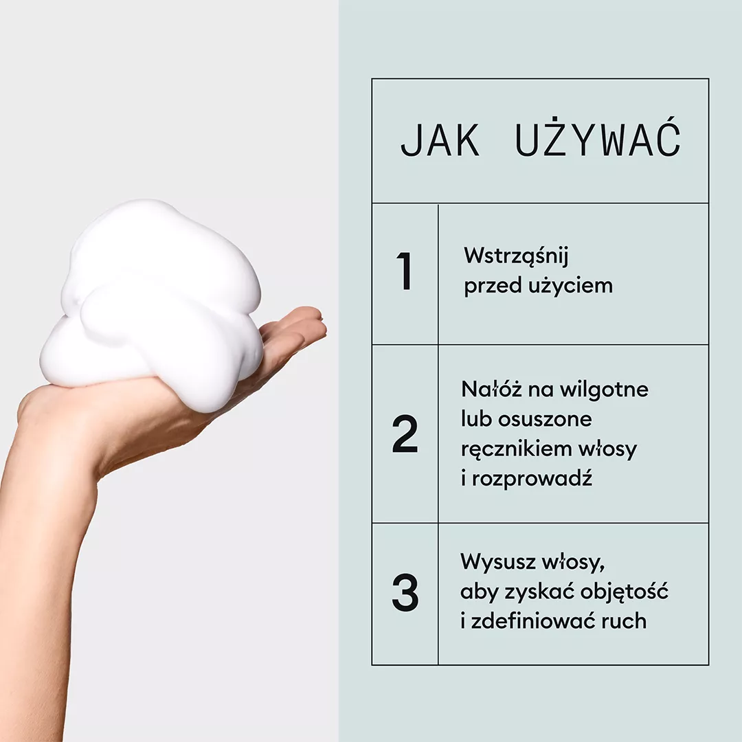 - Nanieś niewielką ilość musu na wilgotne włosy, równomiernie rozprowadź od nasady po końce.