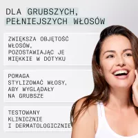 - Natychmiast zwiększa objętość włosów – widocznie pogrubia i unosi pasma już po pierwszym użyciu.