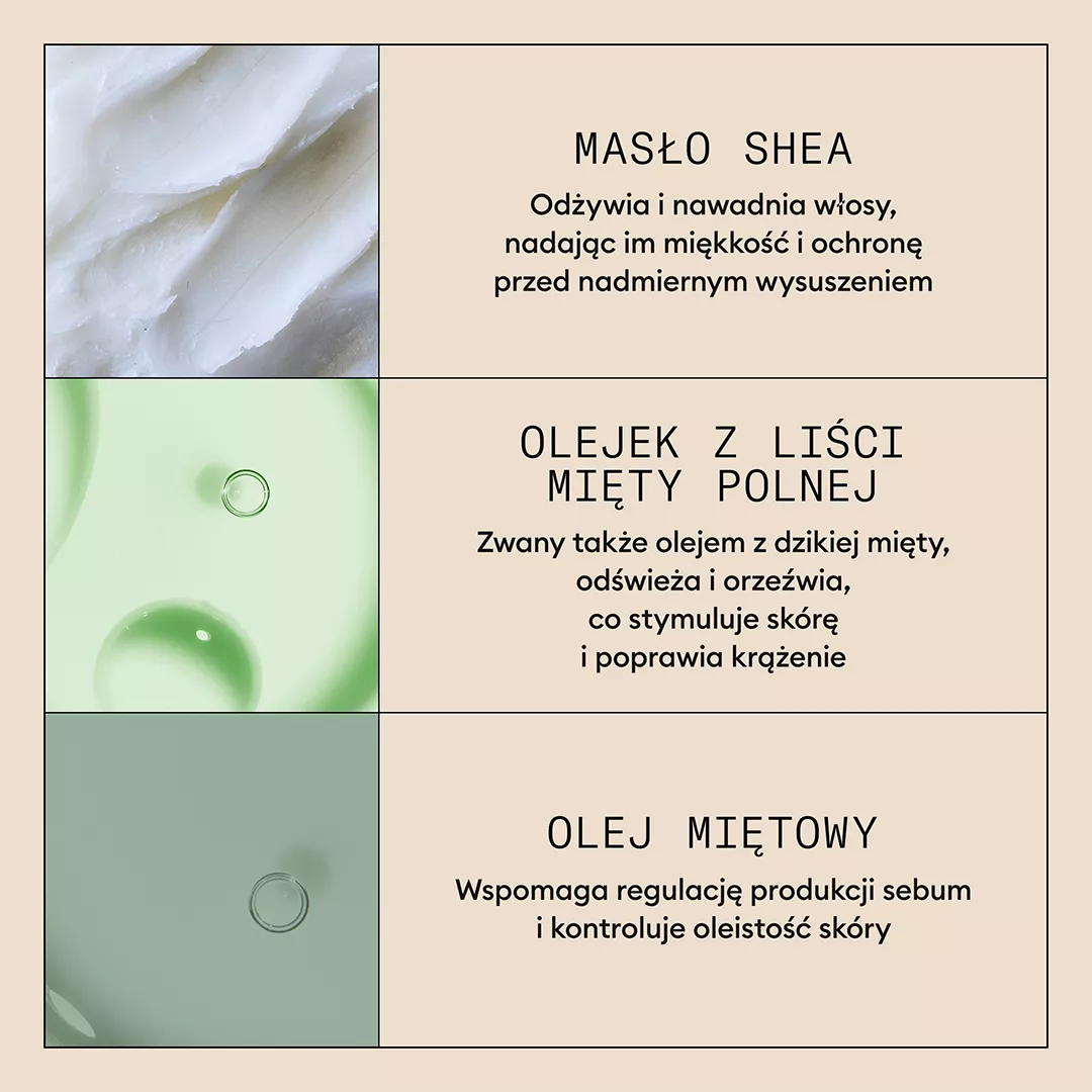 - Normalizuje i odświeża skórę głowy, przygotowując ją do dalszych etapów pielęgnacji