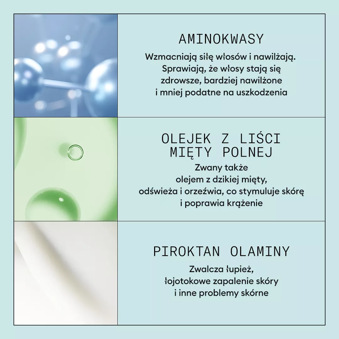 - Ekstrakt z zielonej herbaty – łagodzi i wspiera regenerację skóry głowy