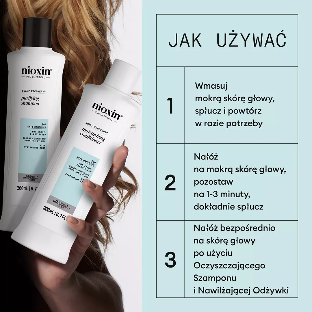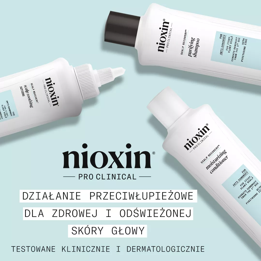 Nioxin Scalp Recovery system przeciwłupieżowy i do swędzącej skóry głowy to zaawansowane rozwiązanie stworzone z myślą o osobach zmagających się z łupieżem, podrażnioną i swędzącą skórą głowy oraz przerzedzającymi się włosami. Marka Nioxin, z ponad 30-letnim doświadczeniem w pielęgnacji włosów, gwarantuje skuteczność i bezpieczeństwo stosowania dzięki innowacyjnym formułom oraz starannie dobranym składnikom aktywnym. System działa już od pierwszego użycia, widocznie oczyszczając skórę głowy, redukując łupież i przywracając naturalną równowagę, a jednocześnie wspiera zdrowie i objętość włosów.