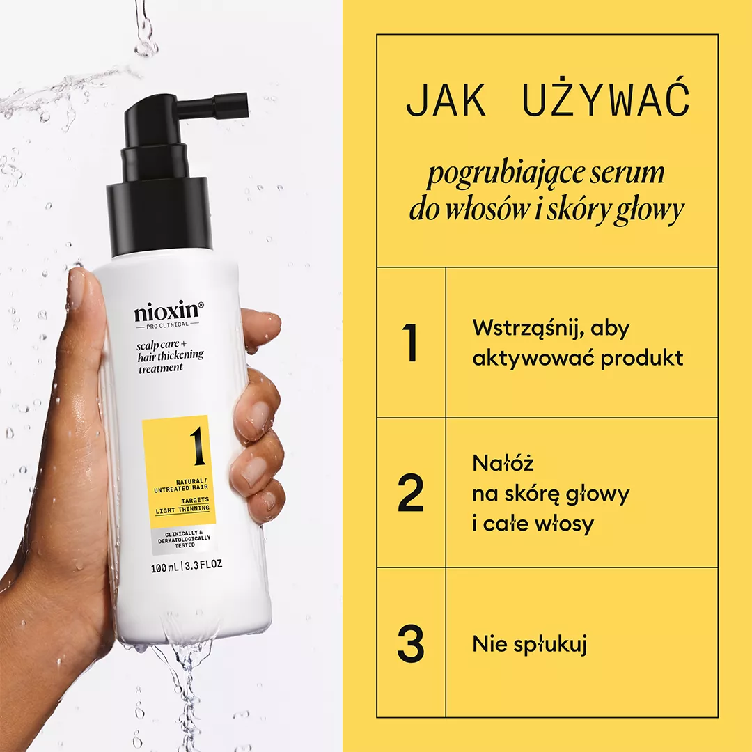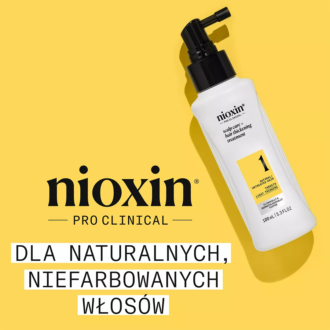Nioxin System 1 serum bez spłukiwania to innowacyjne rozwiązanie stworzone z myślą o osobach posiadających naturalne włosy z lekkim przerzedzeniem. Marka Nioxin, będąca ekspertem w pielęgnacji włosów przerzedzonych od ponad 30 lat, oferuje produkty oparte na zaawansowanych technologiach i skutecznych składnikach aktywnych. Serum System 1 odświeża skórę głowy, zwiększa objętość włosów i sprawia, że stają się one wizualnie grubsze oraz pełniejsze już po pierwszym użyciu. Regularne stosowanie wszystkich produktów z serii Nioxin System 1 pozwala wyraźnie pogrubić włosy, co potwierdziło aż 85% badanych po 30 dniach stosowania*.