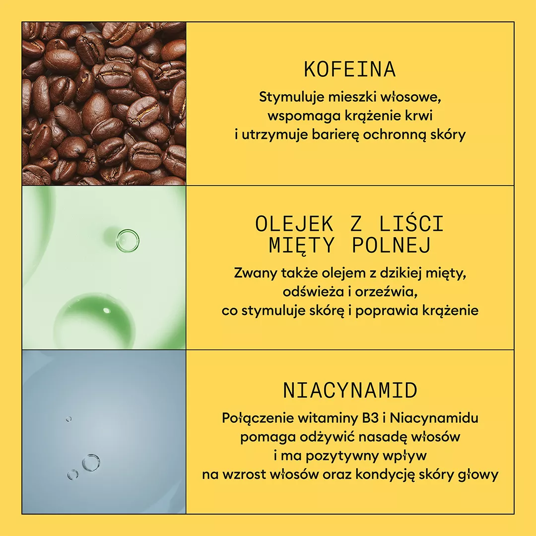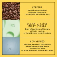 - Zaawansowana formuła – zawiera niacynamid, olejek z dzikiej mięty oraz kofeinę, które intensywnie odżywiają cebulki, stymulują mieszki włosowe i wspierają zdrowy wzrost włosów.
