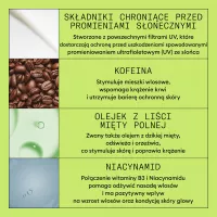 - Formuła zawiera składniki aktywne, które zabezpieczają skórę głowy oraz włosy przed szkodliwym promieniowaniem UV.