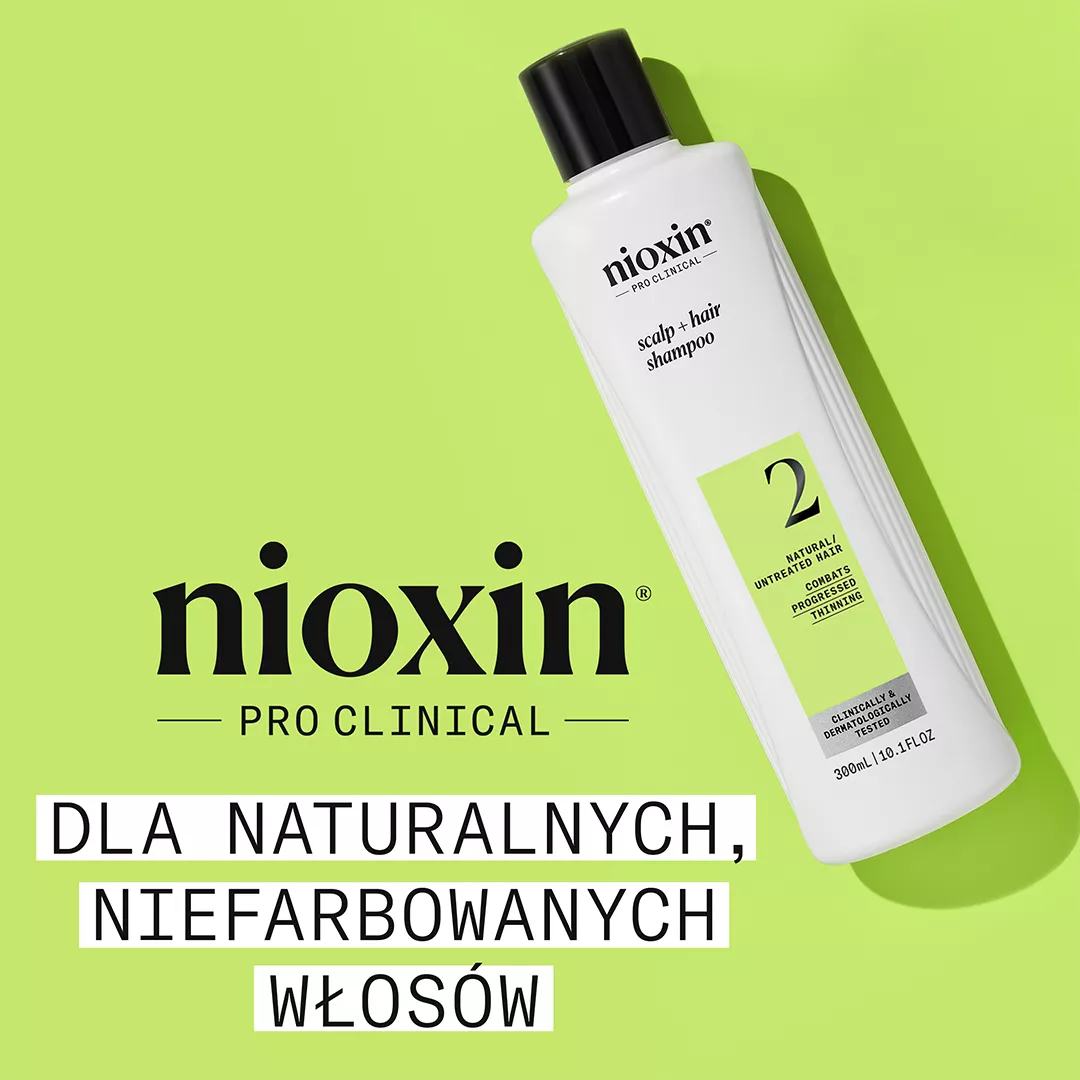 Nioxin System 2 szampon oczyszczający do włosów naturalnych, mocno przerzedzonych to profesjonalny produkt rekomendowany osobom borykającym się z widocznym przerzedzeniem włosów. Opracowany z wykorzystaniem ponad 30-letniego doświadczenia marki Nioxin, szampon stanowi pierwszy krok w trzyetapowym systemie pielęgnacji, który efektywnie wzmacnia włosy, zwiększa ich objętość i poprawia kondycję skóry głowy. Zaawansowana technologia oraz unikalna formuła z niacynamidem, biotyną i kofeiną sprawiają, że już po pierwszym użyciu można odczuć odświeżenie, a regularne stosowanie całej serii Nioxin System 2 pogrubia włosy, co potwierdziło aż 85% badanych po 30 dniach stosowania*.