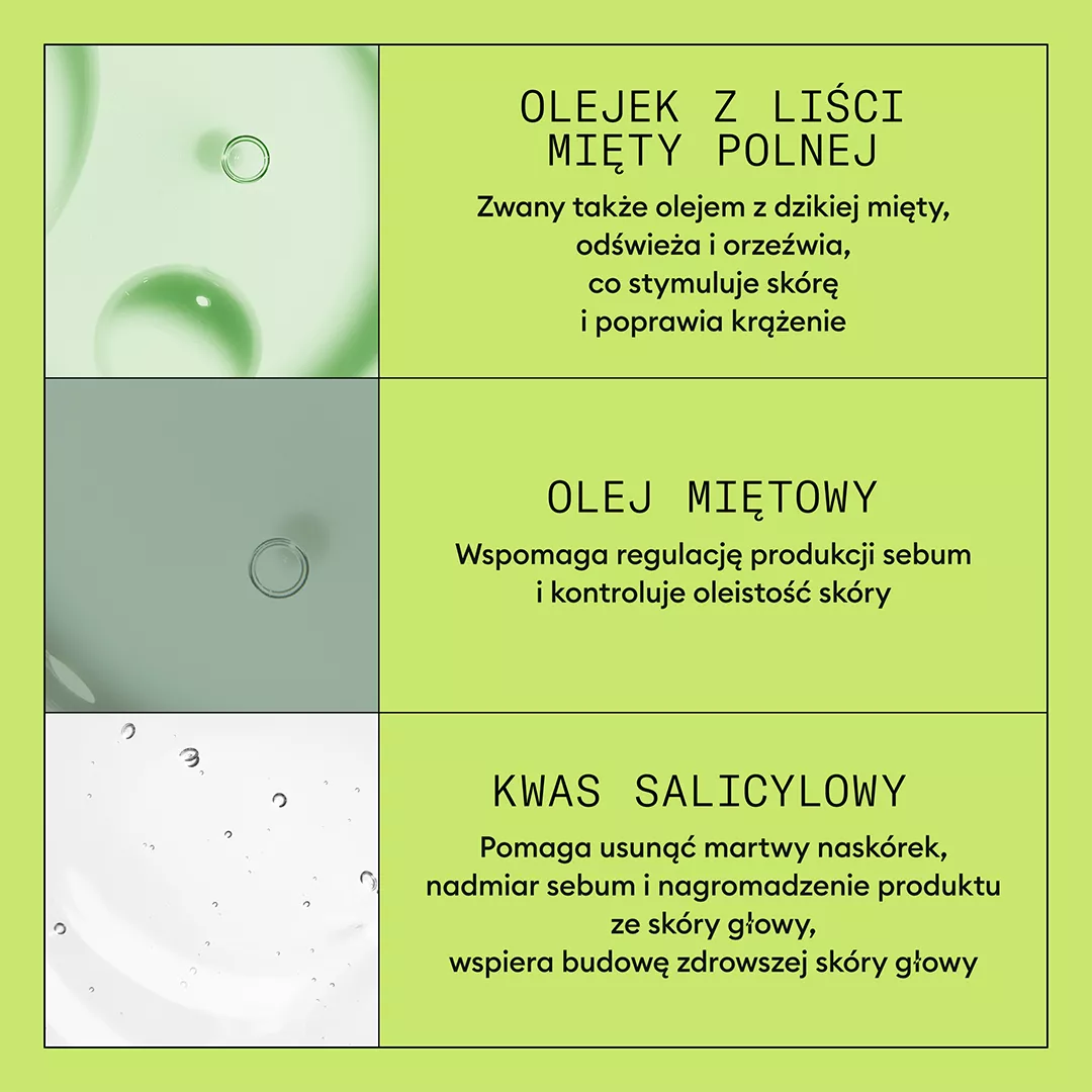- Dodatek olejku miętowego zapewnia intensywne odświeżenie skóry głowy już po pierwszym użyciu.
