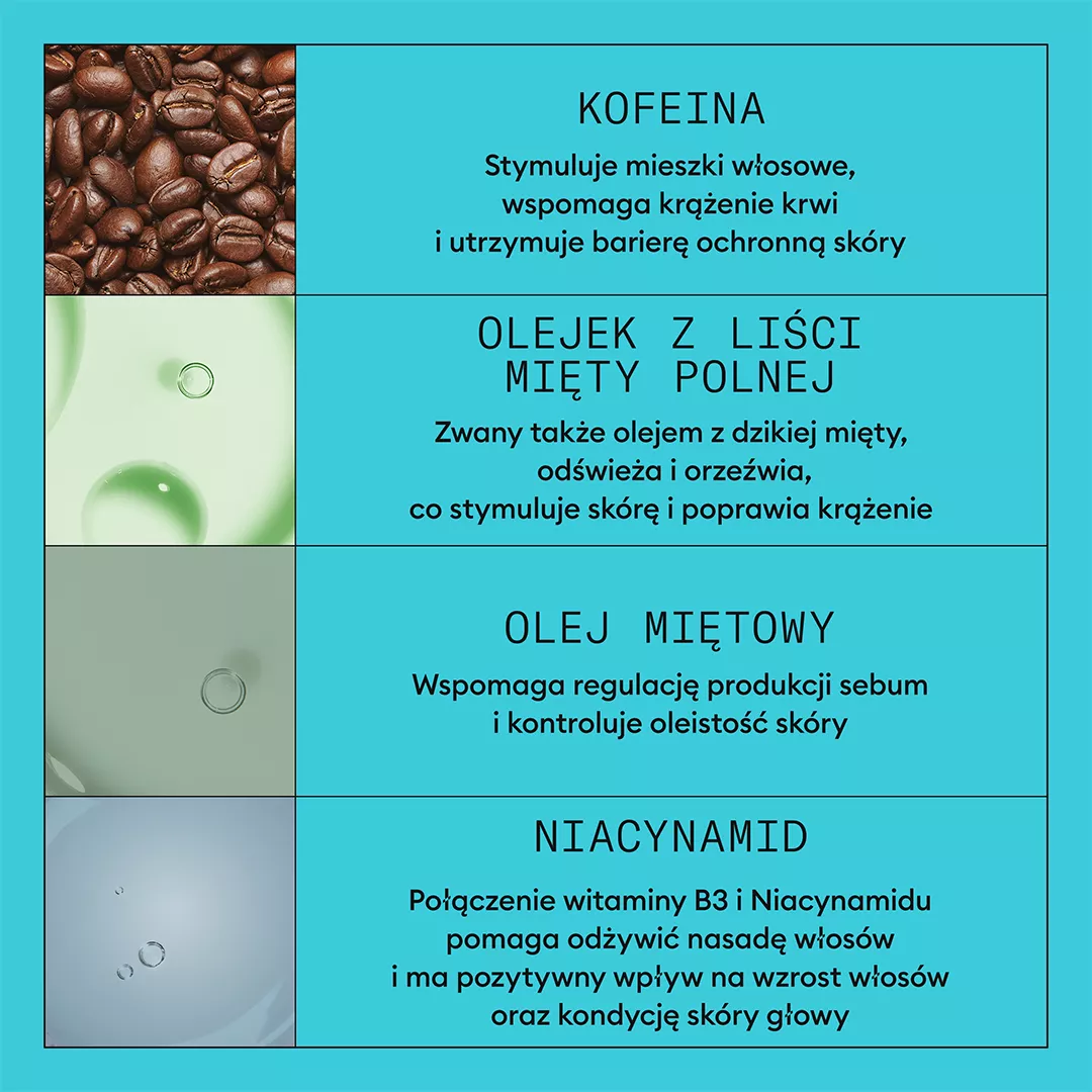 - Odświeża skórę głowy oraz zwiększa objętość i gęstość każdego włosa