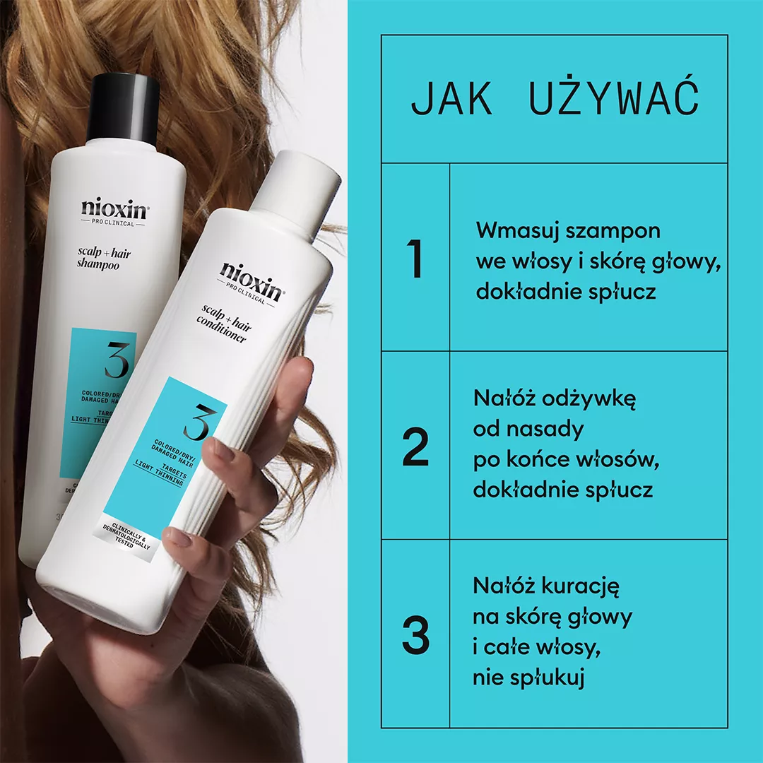 Nioxin System 3 zestaw oczyszczający do włosów farbowanych i lekko przerzedzonych to profesjonalna, trzystopniowa kuracja, która skutecznie wzmacnia włosy, nadaje im pełniejszy wygląd i chroni przed łamaniem. Oparta na ponad 30-letnim doświadczeniu marki Nioxin, seria System 3 wykorzystuje zaawansowaną technologię pielęgnacji skóry głowy oraz składniki roślinne i przeciwutleniacze, by zapewnić widocznie grubsze, mocniejsze i zdrowsze włosy już po pierwszym miesiącu stosowania. Zestaw został opracowany z myślą o włosach farbowanych z lekkim przerzedzeniem – zarówno dla kobiet, jak i mężczyzn.