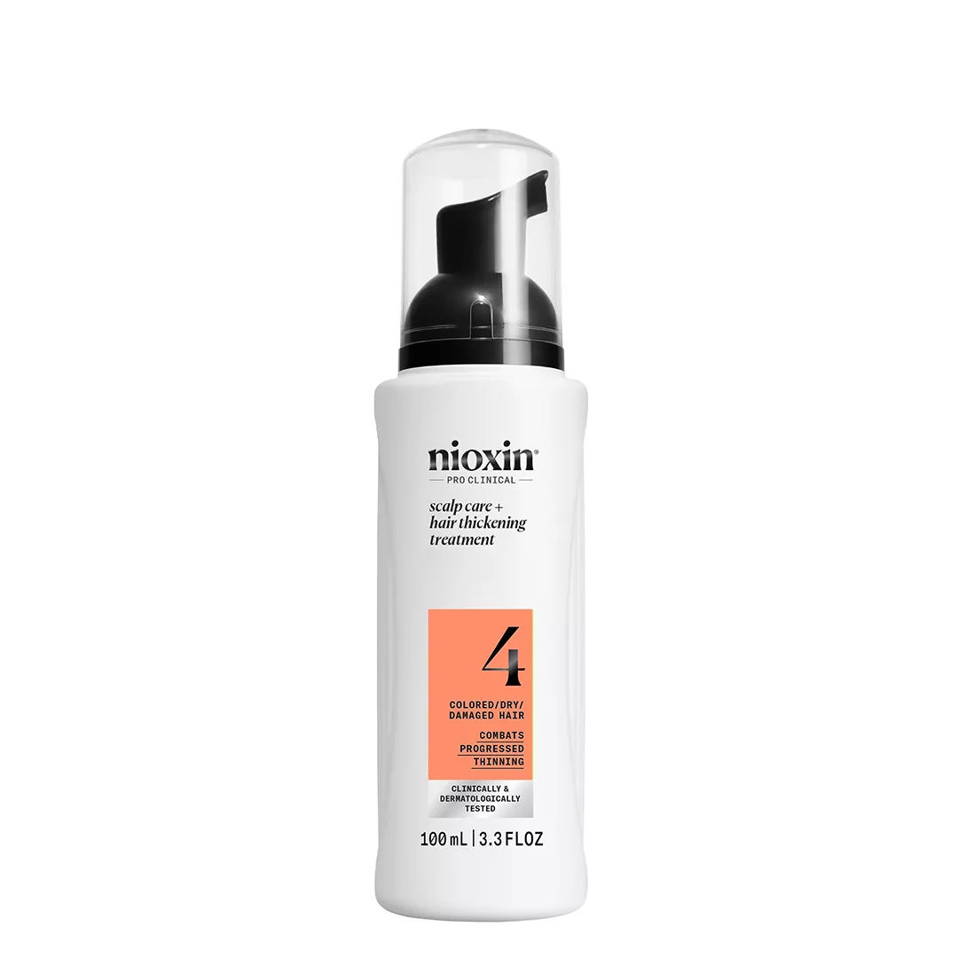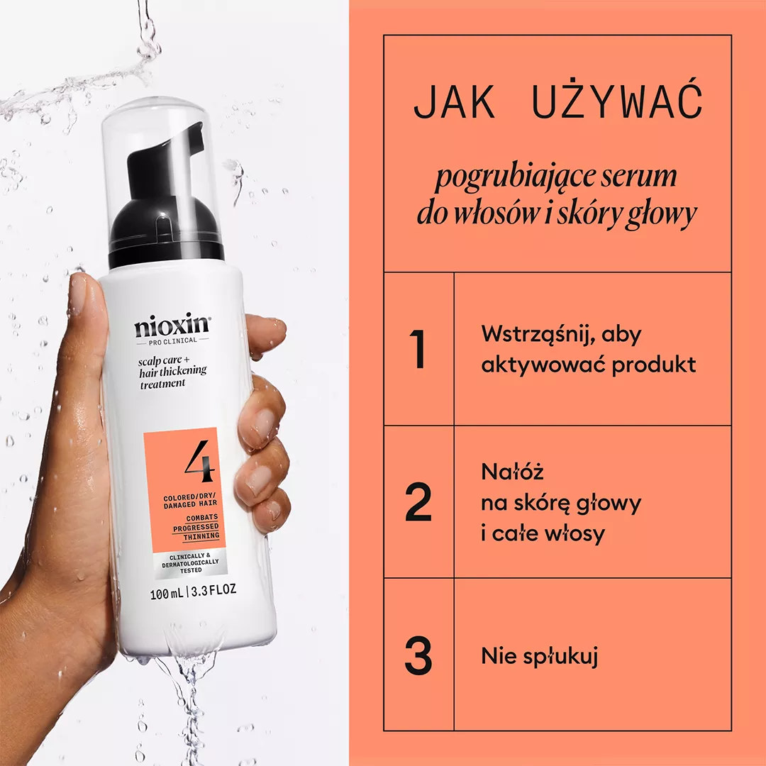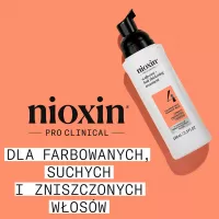 Nioxin System 4 serum bez spłukiwania to zaawansowana kuracja przeznaczona do pielęgnacji skóry głowy i włosów farbowanych, mocno przerzedzonych. Dzięki ponad 30-letniemu doświadczeniu marka Nioxin oferuje skuteczne rozwiązania dla osób zmagających się z postępującym przerzedzaniem włosów. Serum odświeża skórę głowy, zwiększa objętość i pogrubia strukturę włosów, zapewniając widoczny efekt już po pierwszym użyciu. To ostatni etap trzyetapowego systemu pielęgnacyjnego Nioxin, który wzmacnia teksturę i chroni włosy przed łamaniem. Badania potwierdzają, że regularne stosowanie produktów z serii Nioxin System 4 widocznie pogrubia włosy nawet u 85% użytkowników*.