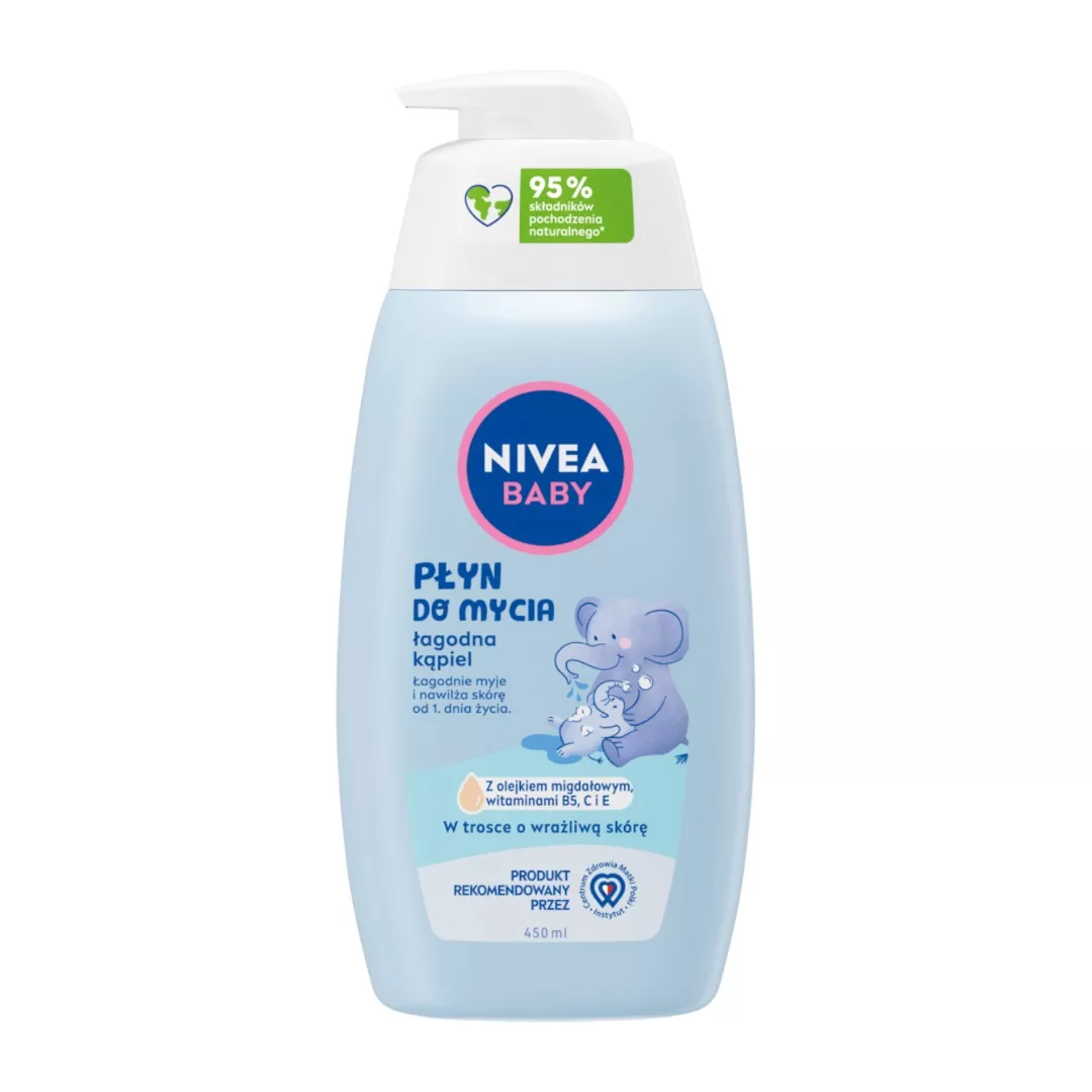 Odkryj Nivea Baby płyn do mycia łagodna kąpiel, który nie tylko łagodnie myje, ale także pomaga utrzymać naturalne nawilżenie oraz chroni i wzmacnia skórę dziecka, wspierając jej naturalny proces rozwoju od 1. dnia życia. Zawiera w 100% naturalny olejek migdałowy oraz witaminy B5, C i E. Produkt został stworzony tak, aby minimalizować ryzyko alergii**. Jego tolerancja dla delikatnej i wrażliwej skóry niemowląt i dzieci została potwierdzona dermatologicznie i jest rekomendowany przez Instytut Centrum Zdrowia Matki Polki. Formuła płynu jest wegańska, biodegradowalna^ i nie zawiera mikroplastiku^^.