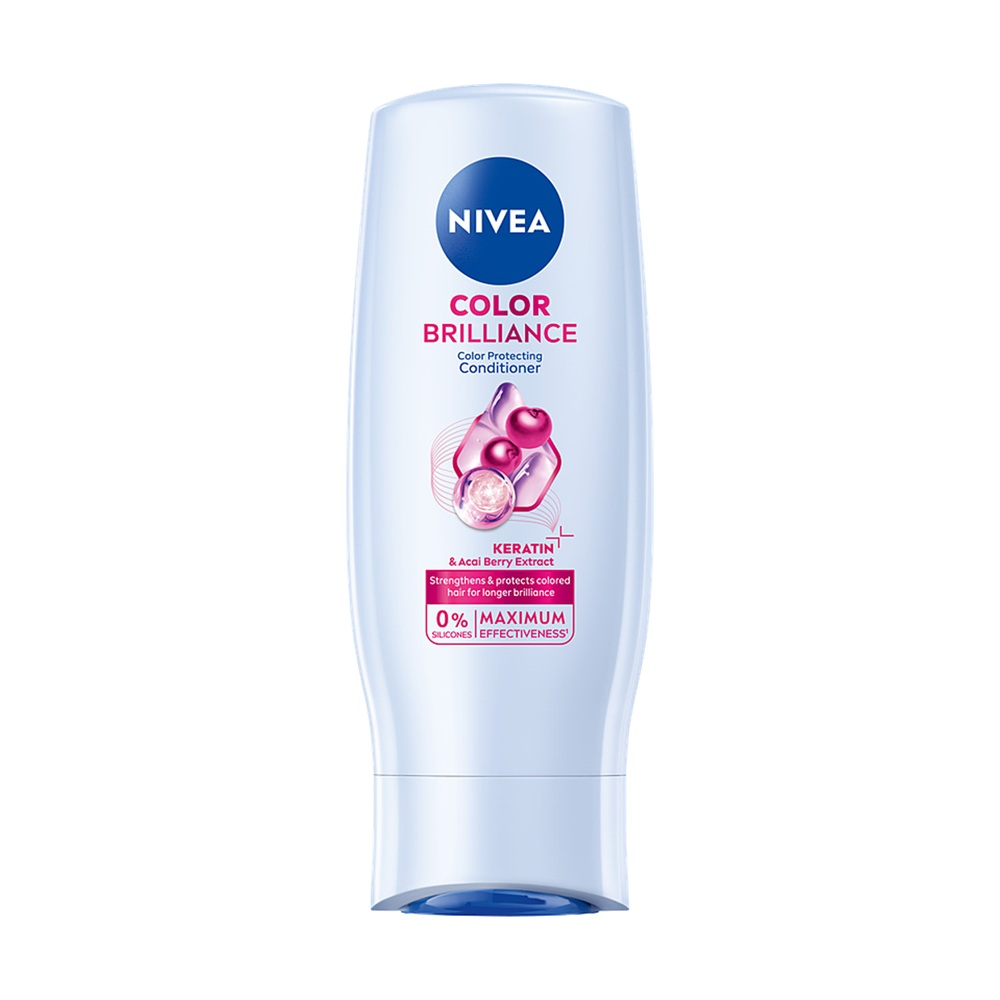 Odkryj skuteczną ochronę koloru farbowanych włosów z odżywką Nivea Color Brilliance. To innowacyjny kosmetyk, który dzięki biodegradowalnej formule z ekstraktem z jagód acai oraz keratyną, intensywnie pielęgnuje zarówno włosy, jak i skórę głowy. Stworzona z myślą o zachowaniu intensywności i blasku koloru, odżywka pomaga utrzymać piękny wygląd włosów na dłużej, zapewniając im zdrowy wygląd i miękkość. Formuła produktu nie zawiera silikonów ani mikroplastików, a butelka pochodzi w 96% z recyklingu (z wyłączeniem etykiet), co czyni ją wyborem przyjaznym dla środowiska.
