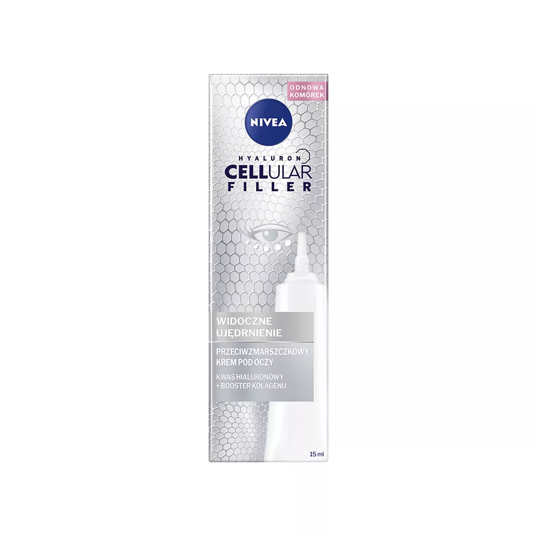 Młodo wyglądająca skóra jest widocznym odbiciem witalności komórek w głębokich warstwach skóry. Dowody naukowe wskazują, że pomimo upływu czasu, komórki te mogą być ponownie aktywowane. Nivea Hyaluron Cellular Filler Widoczne Ujędrnianie Przeciwzmarszczkowy Krem pod oczy to innowacyjna formuła zawierająca kompatybilne ze skórą połączenie składników działających na poziomie komórkowym: Kwasu Hialuronowego i Boostera Kolagenu. Aktywuje komórki do produkcji własnego kwasu hialuronowego i kolagenu. Tolerancja dla skóry i oczu potwierdzona dermatologicznie i okulistycznie. Produkt odpowiedni także dla osób noszących szkła kontaktowe. Produkt bez kompozycji zapachowej.