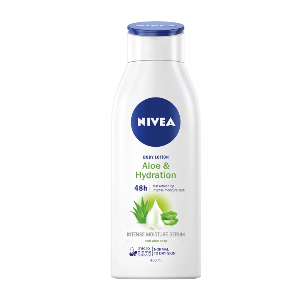 Łagodzący balsam do ciała Nivea Aloe & Hydration to idealne rozwiązanie dla każdego, kto pragnie zdrowo wyglądającej, intensywnie nawilżonej skóry. Produkt wzbogacony o głęboko nawilżające serum i aloes, zapewnia skórze nawilżenie aż przez 48 godzin. Dzięki swojej lekkiej formule natychmiastowo się wchłania, pozostawiając skórę odświeżoną, ukojoną i z przyjemnym zapachem.
