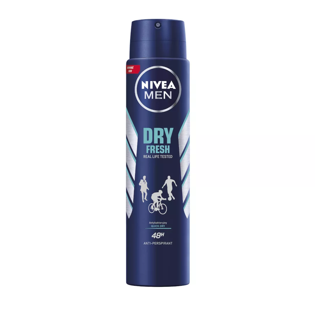 Połączenie efektywności linii Dry z chęcią uzyskania przyjemnego i świeżego zapachu zaowocowało stworzeniem linii Dry Fresh. Nowoczesny i męski zapach zawiera aromatyczne i drzewne nuty połączone z jaśminem i cytrusami. Unikalna i silna formuła dualactive gwarantuje skuteczną ochronę przed poceniem i przykrym zapachem dzięki połączeniu dwóch aktywnych składników antyperspiracyjnych, tworząc jeden z najsilniejszych antyperspirantów w gamie produktów NIVEA. Skuteczność przetestowana w rzeczywistych warunkach. Nie zawiera alkoholu etylowego, a łagodność dla skóry została potwierdzona dermatologicznie.