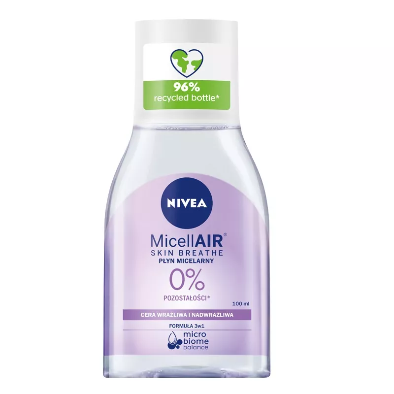 Nivea MicellAir Skin Breathe pielęgnujący płyn micelarny do cery wrażliwej i nadwrażliwej to innowacyjny produkt o formule 3w1, zawierający pantenol i olejek z pestek winogron. Ten płyn micelarny efektywnie usuwa makijaż, łagodnie i skutecznie oczyszcza oraz koi skórę, pomagając redukować zaczerwienienie, napięcie i suchość - trzy oznaki cery wrażliwej.