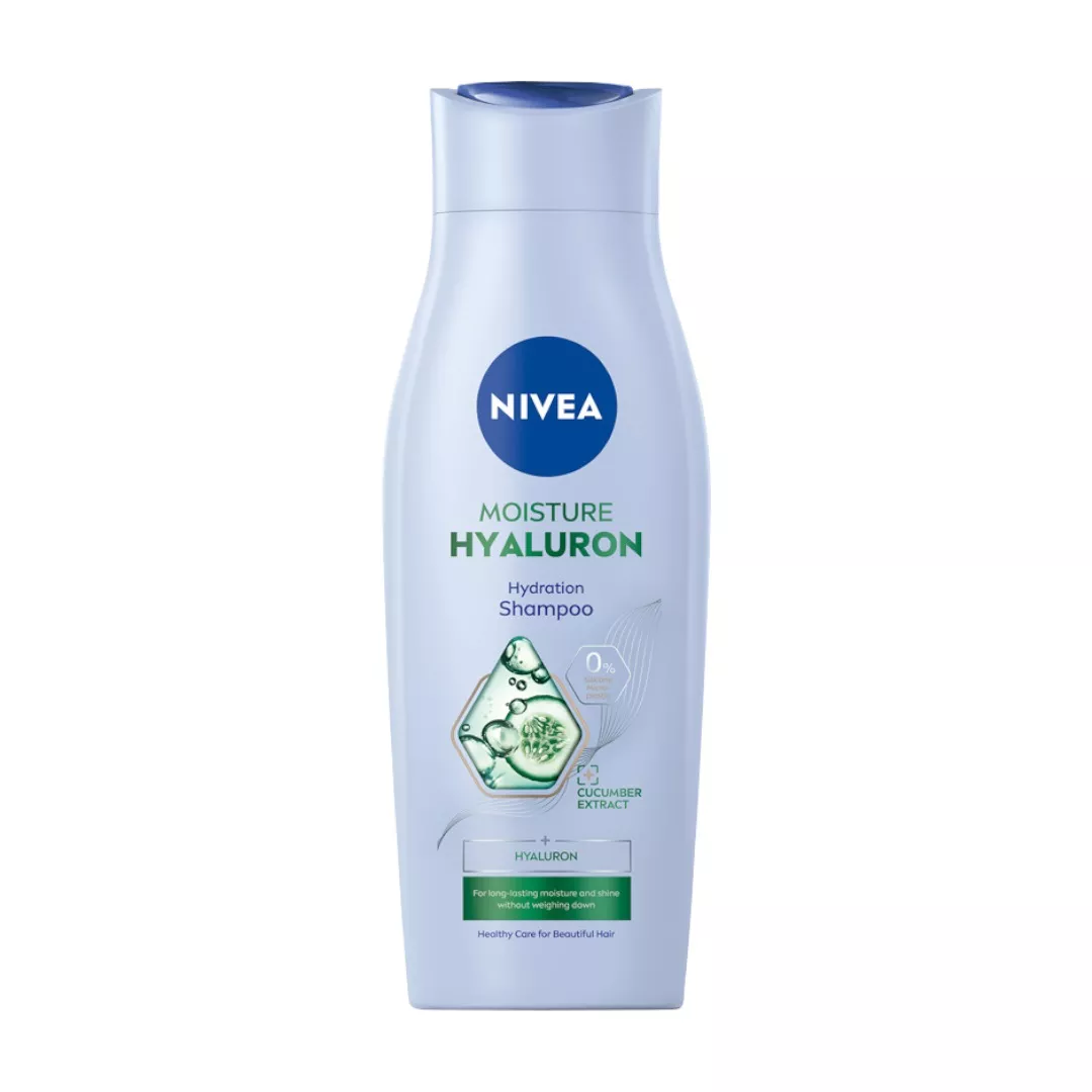 Zapewnij swoim włosom odpowiednie nawilżenie! Postaw na nawilżający szampon z kwasem hialuronowym Nivea Moisture Hyaluron! Formuła z ekstraktem z ogórka i kwasem hialuronowym natychmiastowo nawilża i odnawia blask włosów. Wegańska i biodegradowalna formuła* zapewnia długotrwałe nawilżenie i połysk włosom bez obciążania ich. Formuła szamponu jest wolna od silikonów i mikroplastików**. Butelka szamponu została wykonana w 96% z materiałów pochodzących z recyklingu (z wyłączeniem etykiet). Nivea Moisture Hyaluron - dla pięknych włosów i zdrowej skóry głowy! Tolerancja dla skóry potwierdzona dermatologicznie.