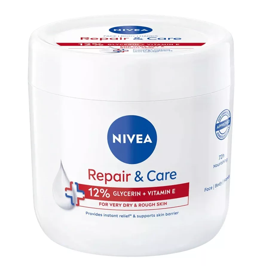 Natychmiastowa ulga dla bardzo suchej i szorstkiej skóry dzięki niezwykle skutecznemu kremowi Nivea Repair & Care. Ten intensywnie pielęgnujący krem przynosi skórze natychmiastową ulgę i zapewnia 72 godziny nawilżenia, dodatkowo pozostawiając ją miękką i gładką. Jego unikalna formuła tworzy barierę ochronną, która pomaga zapobiegać dalszej utracie wilgoci i chroni przed czynnikami zewnętrznymi. Krem jest wzbogacony gliceryną i witaminą E, znanymi ze swoich intensywnych właściwości nawilżających. Poznaj uzdrawiającą moc kremu Nivea Repair & Care, aby cieszyć się widocznie gładszą skórą. Tolerancja dla skóry potwierdzona dermatologicznie.