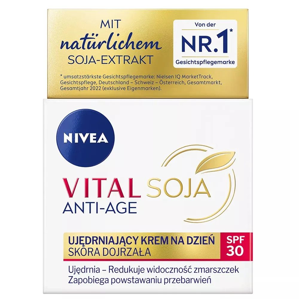 Nivea Vital Soja Anti-Age to ujędrniający krem na dzień przeznaczony dla skóry dojrzałej, wzbogacony o SPF 30. Jego bogata formuła zawiera naturalny ekstrakt z soi, który przy regularnym stosowaniu redukuje główne oznaki starzenia się skóry. Krem doskonale wtapia się w skórę, zapewniając jej komfort przez cały dzień, a jednocześnie skutecznie chroni przed szkodliwym działaniem promieni słonecznych UVA/UVB.