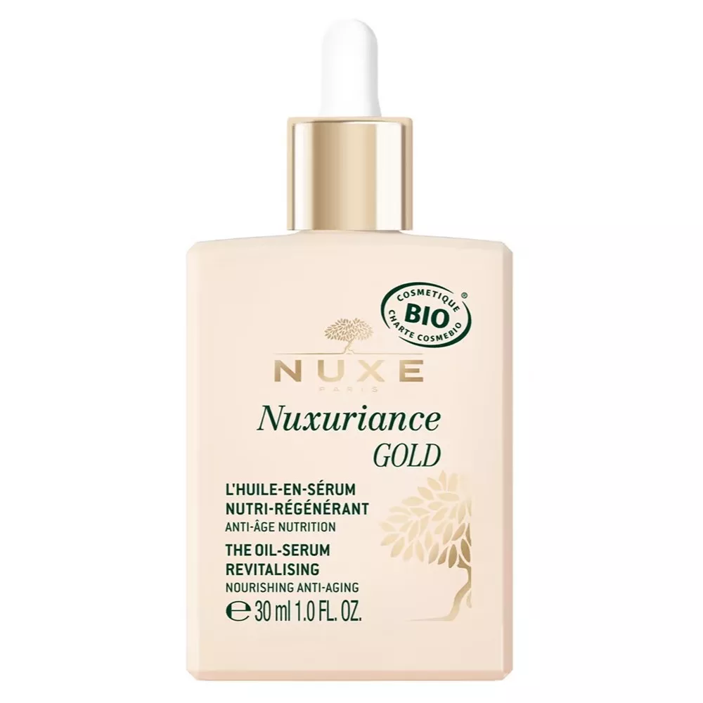 Nuxe Nuxuriance Gold olejowe serum rewitalizujące 30ml to certyfikowane organiczne serum olejowe do twarzy, które wzmacnia i regeneruje skórę. Dzięki kojącym nutom neroli i ekstraktowi olejowemu z ryżu, skóra staje się elastyczna i promienna. Codzienne stosowanie olejku przywraca cerze blask i uczucie komfortu, a naturalny zapach z nutami neroli zapewnia chwilę relaksu.
