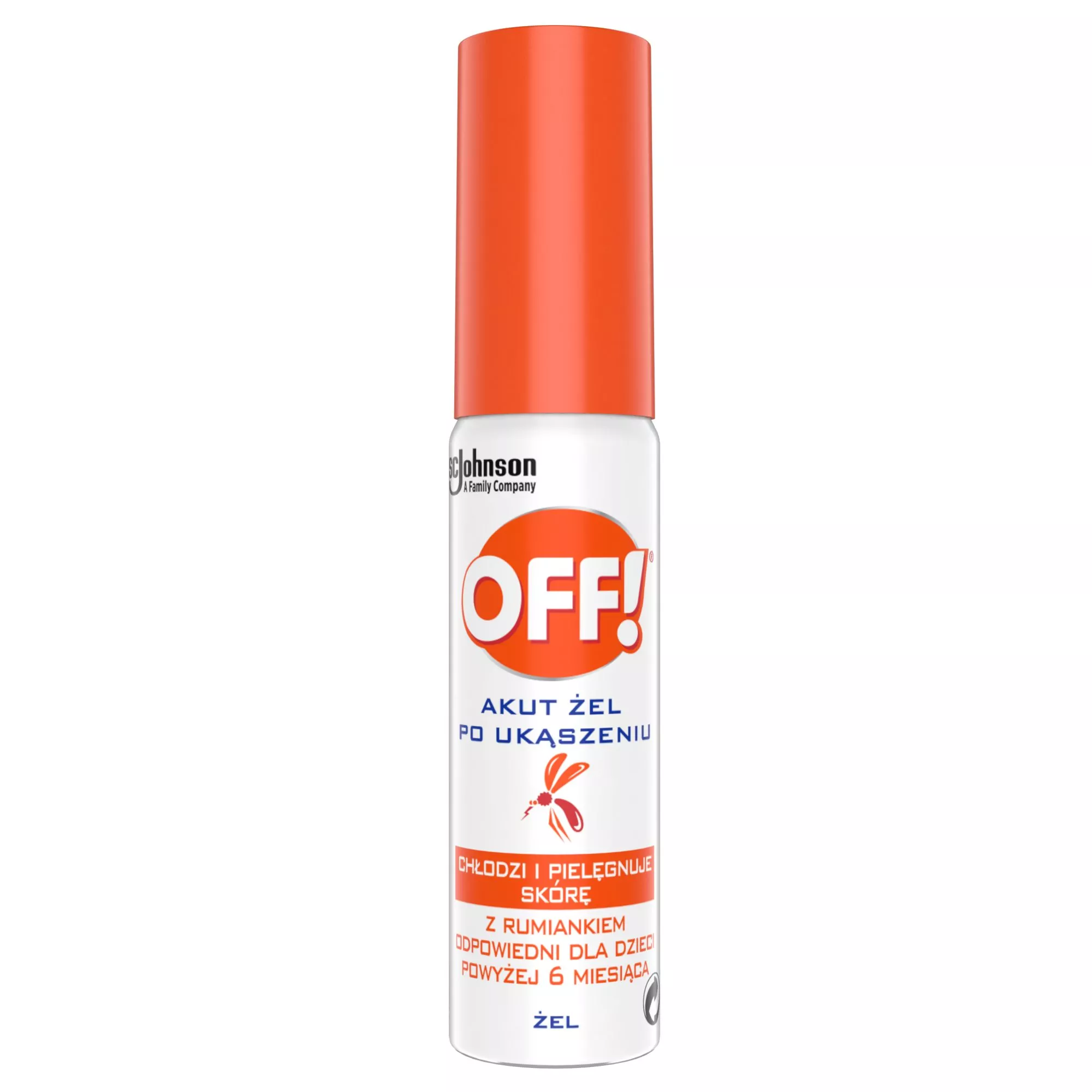 OFF! Akut żel po ukąszeniu 25 ml to skuteczny preparat do łagodzenia skutków ukąszeń owadów oraz podrażnień po kontakcie z pokrzywą. Dzięki zawartości aloesu i wyciągu z rumianku żel przynosi natychmiastową ulgę, zmniejszając świąd, pieczenie oraz zaczerwienienie. Produkt doskonale sprawdzi się podczas aktywności na świeżym powietrzu, zarówno dla dorosłych, jak i dzieci powyżej 2 roku życia.
