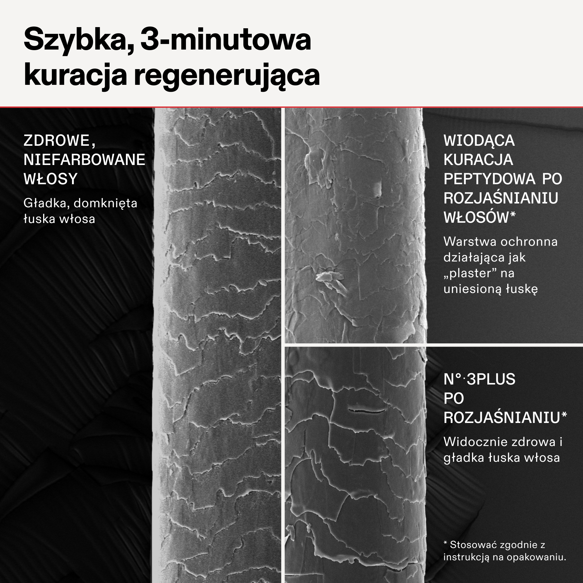 - Odbudowa wszystkich trzech typów wiązań we włosie – kompleksowa ochrona i naprawa struktury pasm.