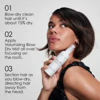 Wysusz włosy do około 75%, następnie aplikuj mgiełkę równomiernie na całej długości, koncentrując się u nasad. Podziel włosy na sekcje i modeluj je, unosząc od nasady, aby uzyskać maksymalną objętość.