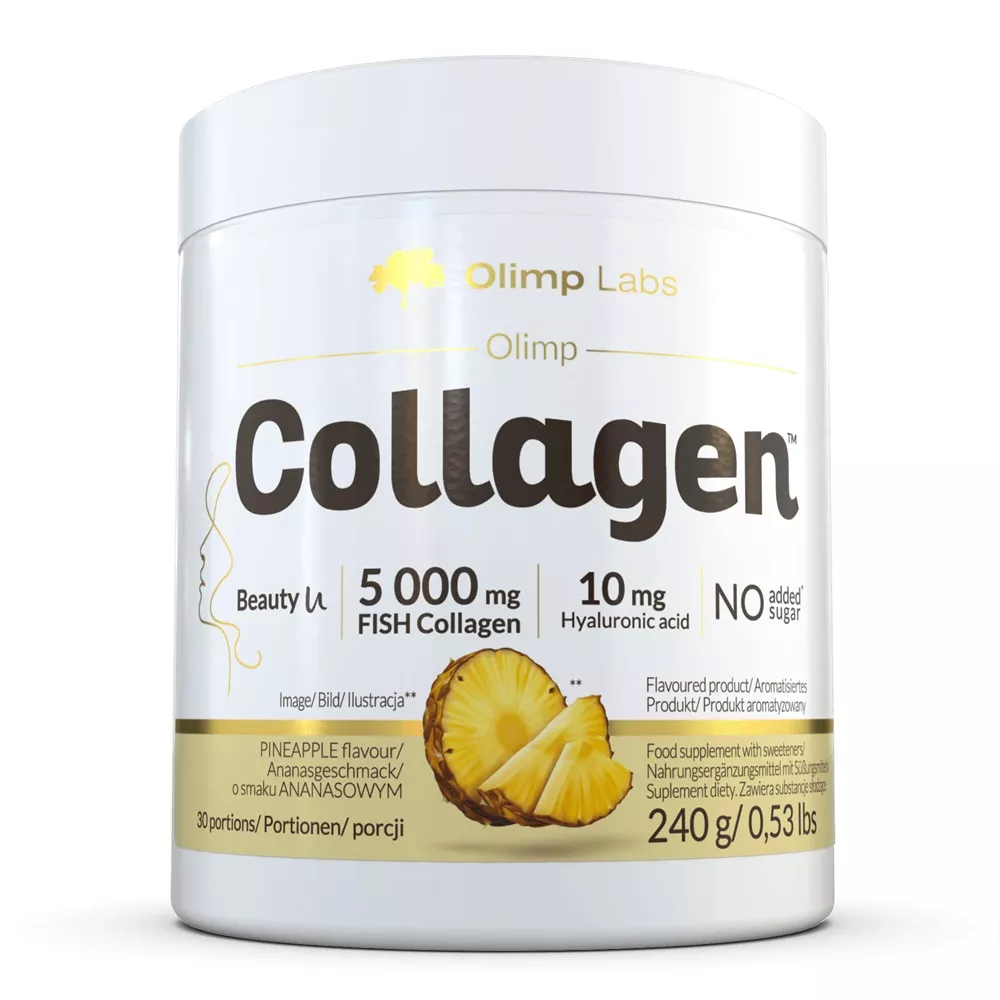 Olimp Labs Olimp Collagen to suplement diety w proszku o orzeźwiającym ananasowym smaku, zawierający hydrolizat kolagenu pochodzenia rybiego. Produkt został opracowany z myślą o kobietach, które pragną zadbać o zdrowy wygląd swojej skóry, a także o mocne, piękne włosy i paznokcie.