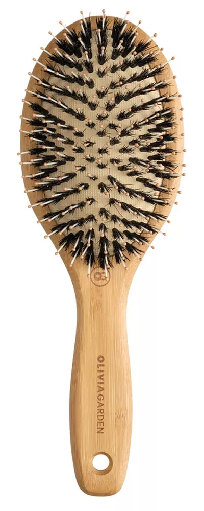 Ekologiczna szczotka do rozczesywania włosów Olivia Garden Bamboo Touch nie tylko rozplątuje włosy, ale również je wygładza, nabłyszcza. Przy czesaniu dodatkowo wykonujesz przyjemny masaż skóry głowy, który pobudza mieszki włosowe do wzrostu. Rączka szczotki została wykonana z bambusa, zastosowano też naturalne włosie z dzika (w połączeniu z nylonem). Musisz wiedzieć, że bambus jest bardzo wytrzymały, a także biodegradowalny - i lżejszy niż drewno. Ergonomiczna rączka ułatwia pracę. Szczotka ma właściwości antystatyczne.