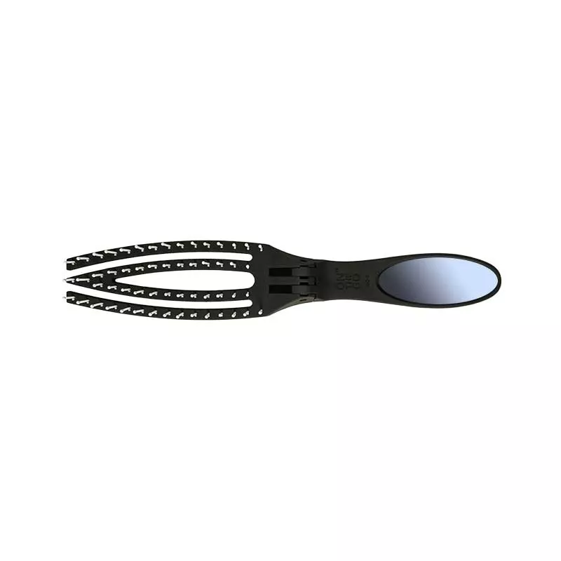 Składana szczotka Olivia Garden Finger Brush On The Go wyposażona jest w zaokrąglone włosie nylonowe. Świetnie pielęgnuje włosy i skórę głowy w trakcie czesania i stylizacji. Posiada zaokrąglone końcówki, które nie uszkadzają struktury włosa i nie ranią skóry głowy. Ponadto włosie ma właściwości antystatyczne i sprawia, że włosy są lśniące. Dzięki składanej konstrukcji zmieści się w każdej kosmetyczce i torebce. Na rączce umieszczone jest małe lusterko, dzięki temu w każdej chwili możesz skontrolować swój wygląd Ponadto duże otwory ułatwiają suszenie. Szczotka przeznaczona jest do czesania włosów suchych i mokrych.