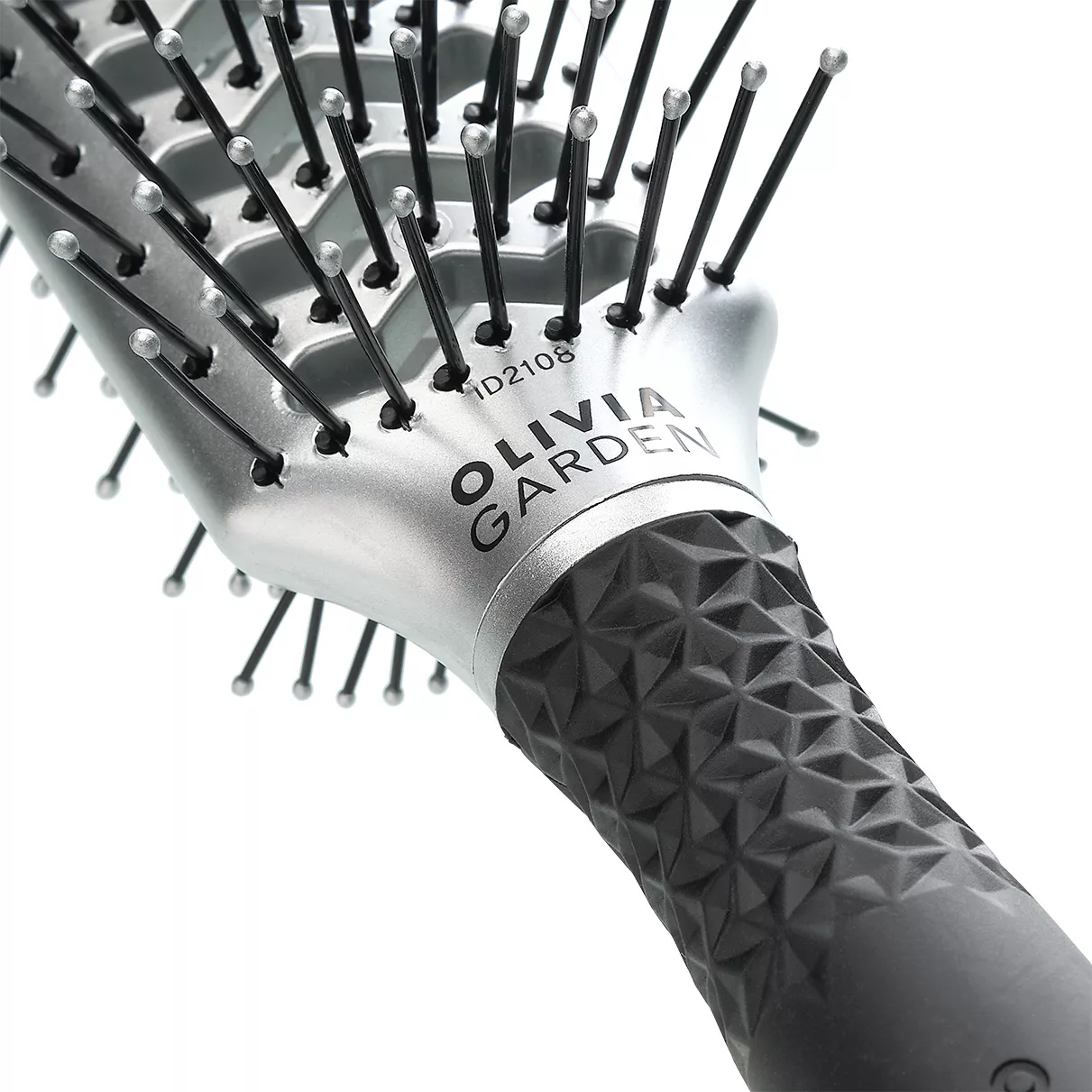 Szczotka do modelowania włosów Olivia Garden Essential Double Tunnel jest niezwykle wygodna i lekka. Wykonano ją z nylonowej szczeciny, która ma właściwości antystatyczne. Dzięki temu włosy nie elektryzują się i nie puszą. Wentylowany korpus skraca czas suszenia. Zaokrąglone wypustki nie podrażniają skóry głowy, a wyjmowany szpikulec ułatwia podział włosów na sekcje. Antypoślizgowa rączka dobrze leży w dłoni i nie ślizga się.