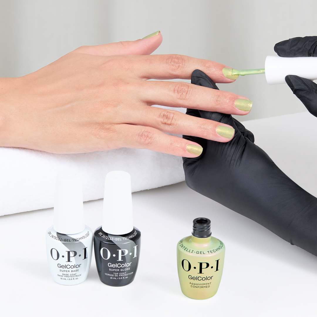Aby zapewnić trwałość manicure, przygotuj paznokcie z użyciem Bond-Aid pH Balancing Agent. Następnie nałóż jedną warstwę bazy GelColor Super Base Base Coat, utwardzaj przez 30 sekund w lampie OPI STAR LIGHT. Nałóż dwie cienkie warstwy wybranego koloru, każdą utwardzając przez 30 sekund. Zakończ aplikacją top coatu, zabezpieczając wolny brzeg paznokcia, i utwardzaj przez kolejne 30 sekund. Usuń lepką warstwę za pomocą wacika nasączonego N.A.S. 99.